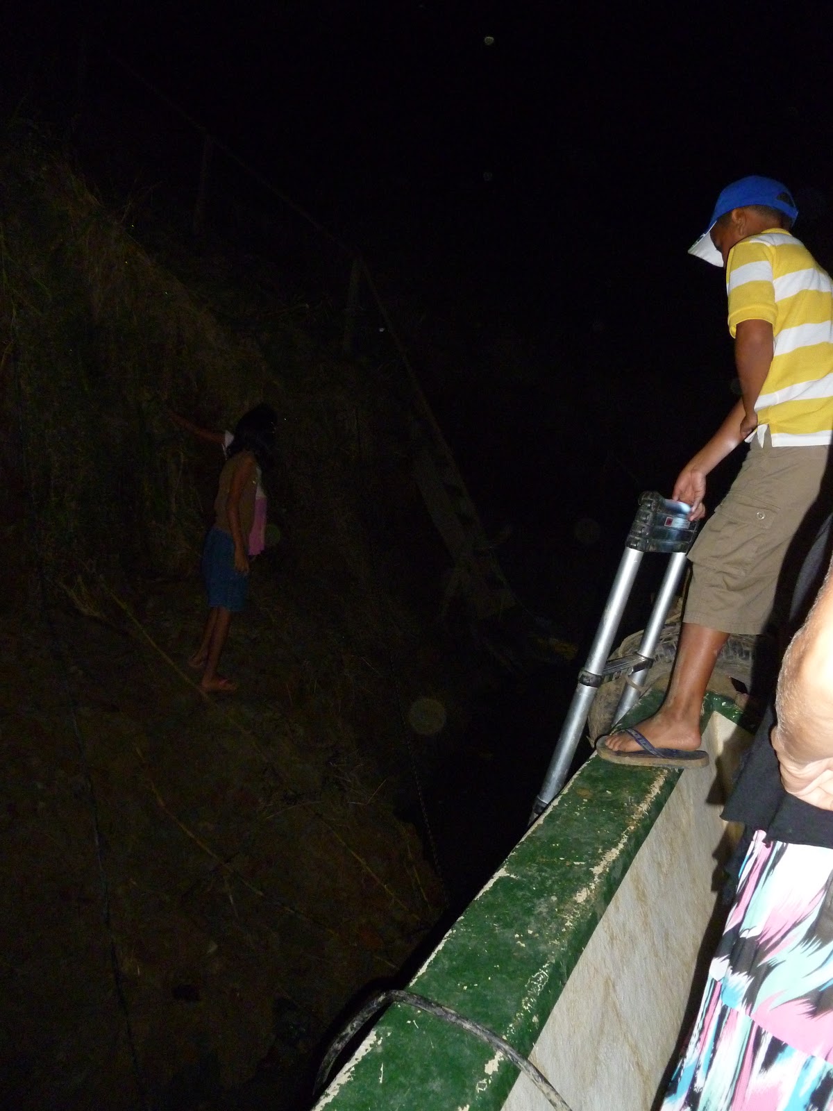 I think it\’s a lot like our Christmas Eve trek, though, . It took us a long time to descend the boat. It was tedious steadying our foot with each step. It took a lot of effort to keep balanced and we were all watching out for each other, trying to share the light from our flashlights as best we could. The climb up the hill was steep and our shoes were caked in mud making each step burdensome.